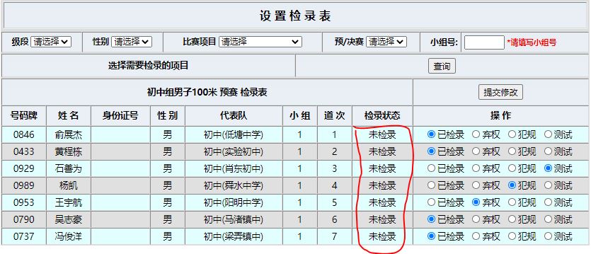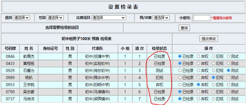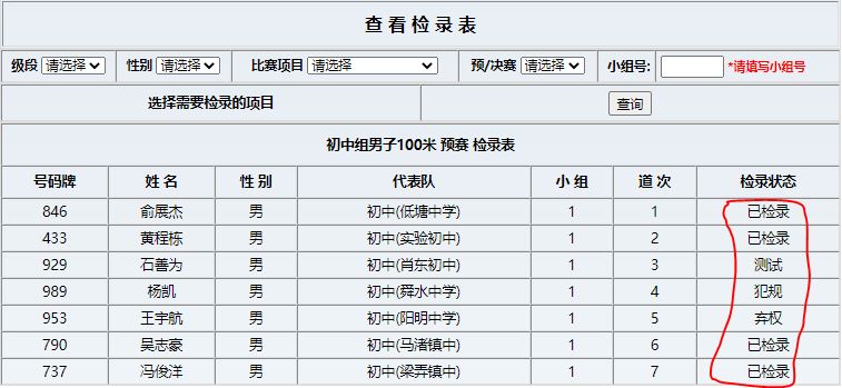 可以看到运动员检录状态分为5种:未检录(默认),已检录,弃权,犯规和测试。弃权和犯规的运动员不允许登记成绩。