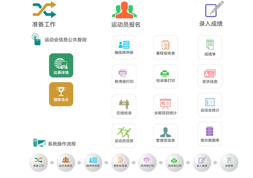 第一步:准备工作。包括下载模板,设置模板和上传模板。 模板是系统的精髓,读懂模板就掌握了系统的工作原理。请大家结合使用说明,认真理解模板每一列的含义,以便设计自己的模板。 一般情况下只需设置比赛项目模板和参赛单位模板,如果有全能项目,还要设置好全能查分表。比赛项目模板的主要目的是确定项目名称,构造运动会项目的大致框架,为赛程安排表提供比赛日期选择,故同一项目无需设置多个名称,日期大致准确即可,因为后面编排秩序册时还可以“微调项目分组表”。参赛单位模板的主要目的是设置代表队名称和报名限额,系统根据参赛单位模板自动生成报名管理员和其他管理员信息。 第二步:运动员报名。可以让报名管理员(班主任)分别登录网站报名,也可以由系统管理员统一报名。若由系统管理员统一批量报名,需要根据比赛项目模板和参赛单位模板设置报名文件,报名文件的格式可参考报名模板。 报名结束后,系统管理员查看是否有各种超额提示,如有,及时修改。检查无误后,打印“报名确认表”,请各代表队核实签字确认。核实报名信息无误,要及时锁定报名状态,停止报名,防止各代表队修改报名信息。 第三步:编排秩序册。依次进行设置号码牌,生成项目分组表,生成竞赛分组表和设置破记录成绩操作。 “系统默认号码牌”按照001,002依次递增,“自定义号码牌”需要预先向网站管理员申请权限,报名时填写自定义的整数号码牌。 系统根据项目,参赛单位模板和报名情况,生成各组别项目信息;若需要修改某些组别的项目信息,可点击“微调项目分组表”,例如要取消某个项目,则将其实际人数设置为0;“微调项目分组表”不影响系统的其他信息,比赛期间也可以随时修改。 系统根据项目分组表和报名信息,自动生成竞赛分组表。竞赛分组表由系统随机分配小组和跑道号,若需要单独修改个别运动员信息,请点击“运动员信息”图标处理。 点击“设置破记录成绩”,可为各组别设置统一的破纪录成绩;若需要为各组别设置不同的破纪录成绩,可点击“微调破记录成绩”;设置破纪录成绩不影响系统的其他信息,比赛期间也可以随时修改。 点击“赛程安排表”图标,进入设置赛程安排表页面,系统提供“网页操作”(默认)和“EXCEL表操作”两种方式,管理员可采用手工和电脑自动设置相结合的方法设置比赛时间。 至此,秩序册生成完毕,可以下载或直接打印各类报表。 第四步:登分和打印成绩。 登陆“登分管理员”账号,点击“录入成绩”图标,按正确格式输入成绩,时间单位为秒,长度单位为米。系统自动为运动员设置排名和分数,自动生成晋级运动员名单。若需要手工调整成绩或排名的,由系统管理员点击“运动员信息”图标,修改相关信息。 点击“成绩单”图标,可下载或直接打印成绩单。 点击“运动会统计”图标,可查看各代表队运动员得分表,团体总分及项目排名表和全部比赛详情。 点击“奖状信息”图标,可下载奖状EXCEL数据表和WORD模板,使用邮件合并技术生成奖状信息。